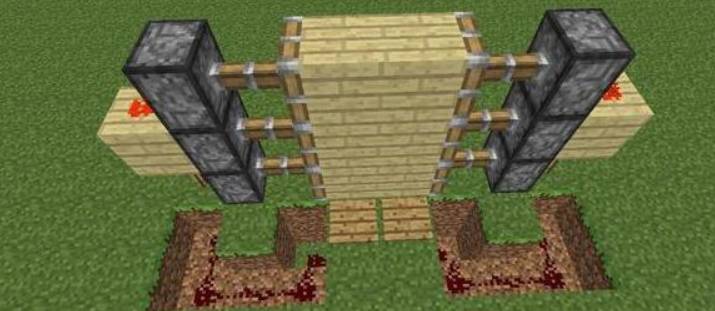 第二步:其次,在每边最下面的粘型活塞的后面放上红石火把,这样就可以激活2个粘性活塞了,在火把最上方,放一个方块在撒上红石粉,然后推动的木板2边都放上2个压力板,一共4个压力板。