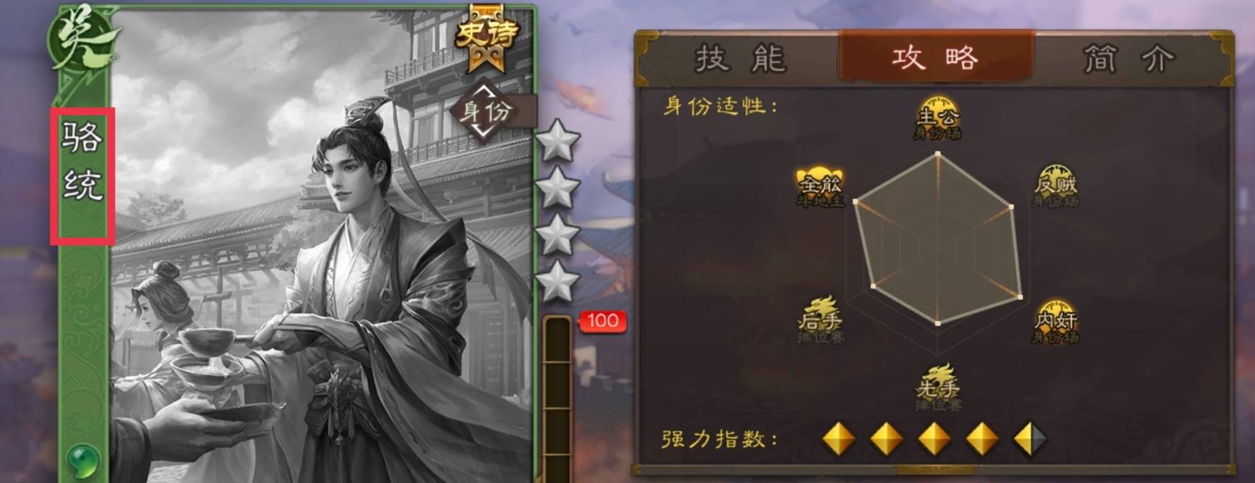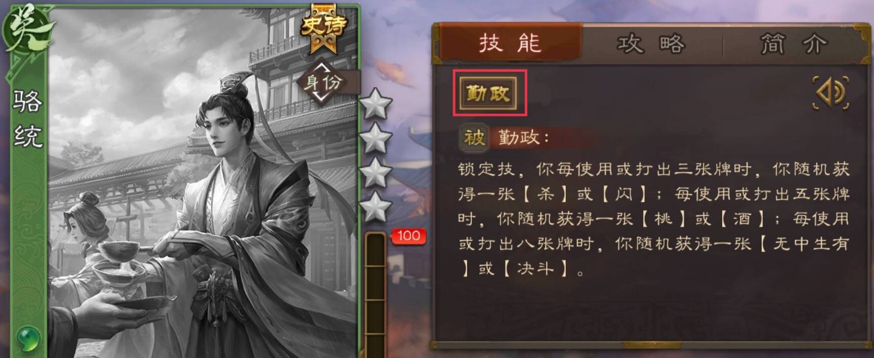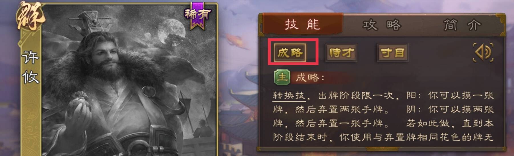 主技能成略,转换技,出牌阶段限一次,摸到阳你可以摸一张牌,然后弃置两张手牌;摸到阴你可以摸两张牌,然后弃置一张手牌。