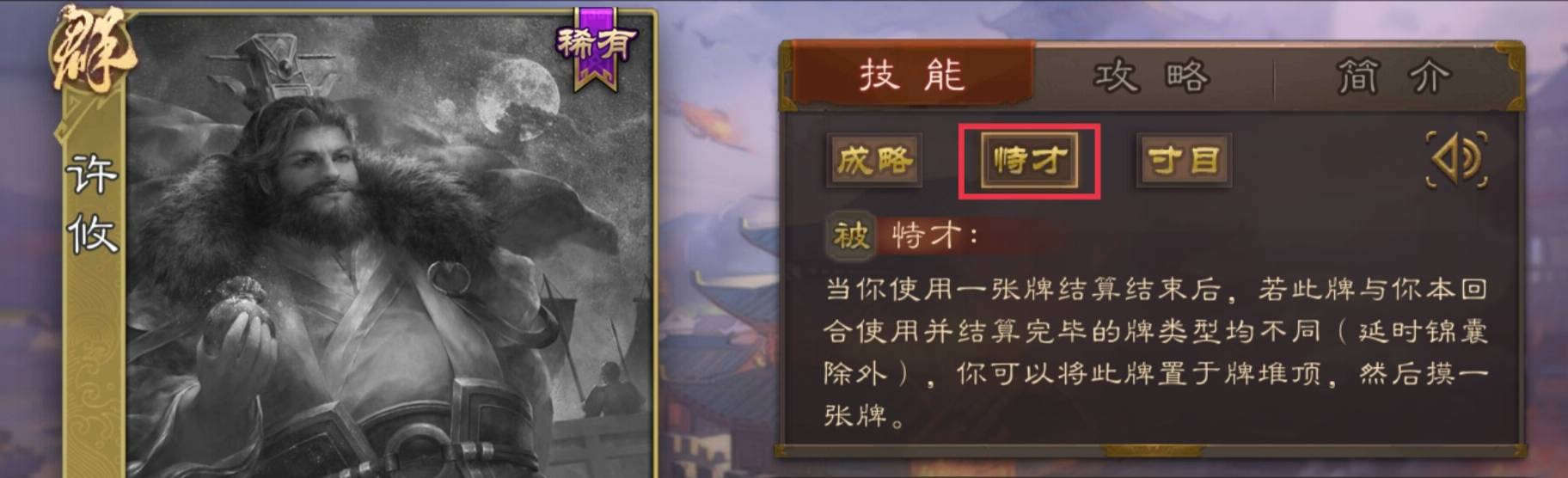 被动技能恃才,当你使用一张牌结算结束后,若此牌与你本回合使用并结算完毕的牌类型均不同(延时锦囊除外),你可以将此牌置于牌堆顶,然后摸一张牌。