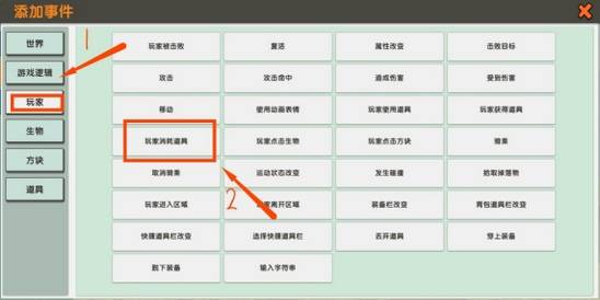 4、先需要添加一个事件,使逻辑有效,事件就=做了什么。点击事件后面的加号,找到玩家选择玩家消耗物品。