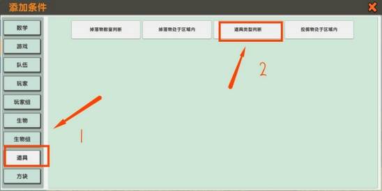 5、目前不能随随便便消耗一个物品就可以召唤地心门,需要加入一个附属条件。点开条件后面的加号添加条件里面找到道具,选择道具判断类型。