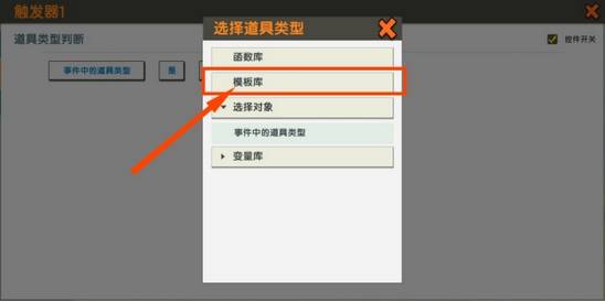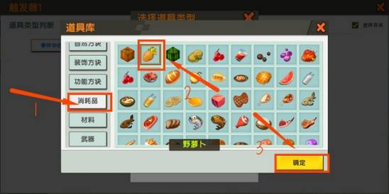 6、仅仅这样还不没完全设置好,条件下面绿色的框框,现在显示有红色的点点。点开绿色的框框。道具类型这里的字是红色的,再点这里。选择道具类型,找到模板库。道具库里面在消耗品这里找到萝卜,之后点击确定就OK了。