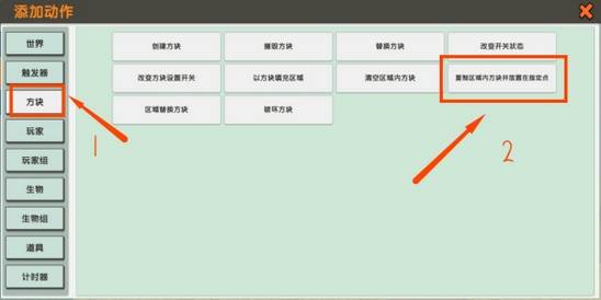 7、事件条件都设置好了,最后还差的就是动作。动作就是发生了什么,没有动作触发器就是无法执行的状态。点击动作后面的加号,添加动作里面在方框里找到,复制区域内的方块并放置在指定点。