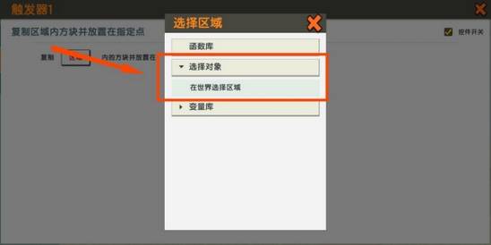 8、动作下面的绿色框框现在和条件之前哪里一样,点开,复制后面的区域选择,选择区域里,找到选择对象,在世界中选择。跳转到对象库后,选择之前框选住的地心门。