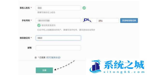 04 接着输入联系人的姓名,手机号码,以及获取到的短信验证码,最后勾选服务协议以后,点击“注册”按钮继续,