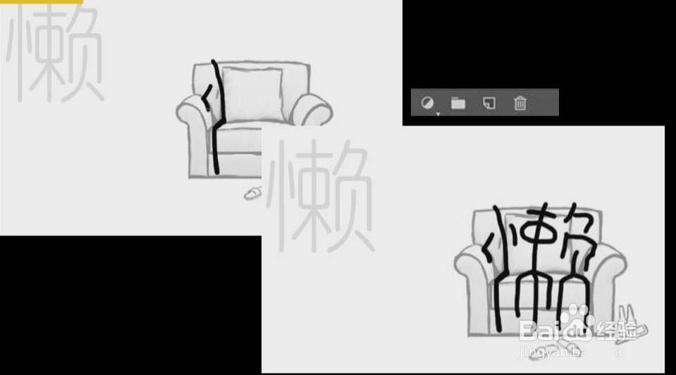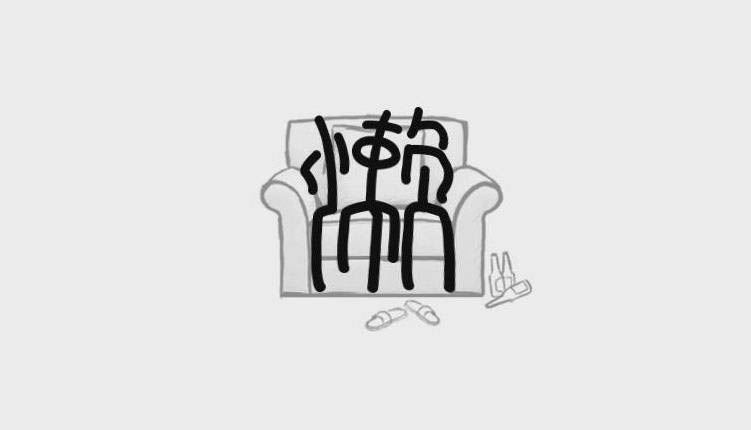 右下角【新建 】图层,6px【画笔工具 】画出“懒”字像人一样瘫在沙发上的感觉,注意字需要像人一样有两个折角。(其中竖心旁的左边一点放在沙发扶手上)