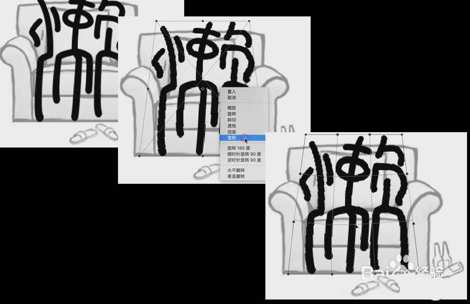 由于字有点悬空的感觉,【右键 】-【变形 】将中部向下拉,使中间折的部分坐在沙发上。