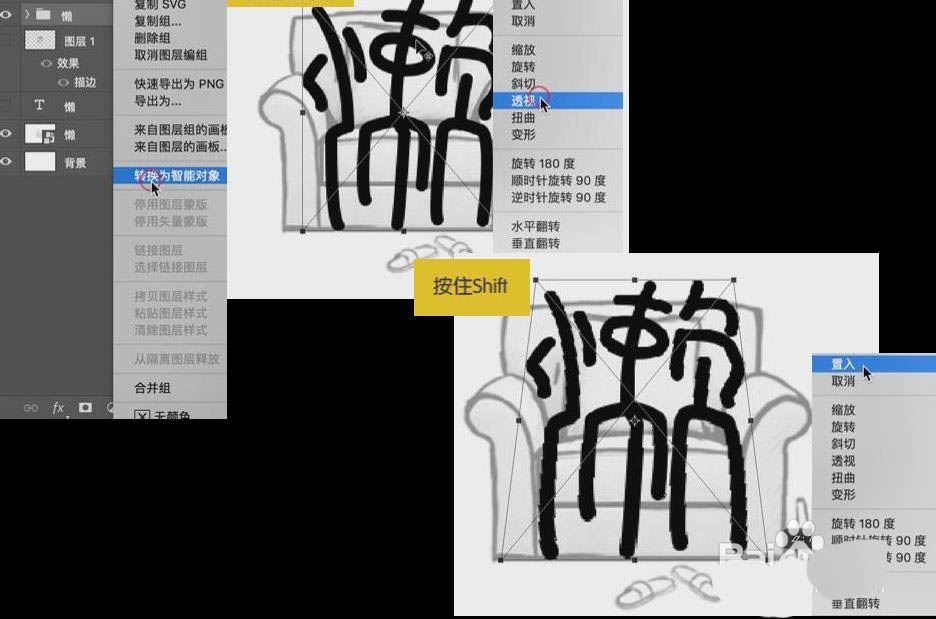 【选中 】组,【右键 】-【转换为智能对象 】,【自由变换 】-【透视 】,按住shift将懒字调整成梯形形状,使字有近大远小的感觉。【右键 】-【置入 】。