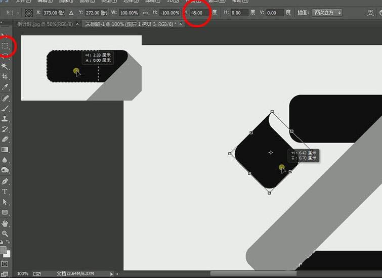【Ctrl+T 】【旋转 】【-45度 】【调整 】位置,【复制 】黑色【图层 】【调整 】位置和长度(注意要用选框工具拖,半圆弧度不能变,如图所示),同样的方法【复制 】黑色【图层 】【调整 】长度 角度,如图所示。