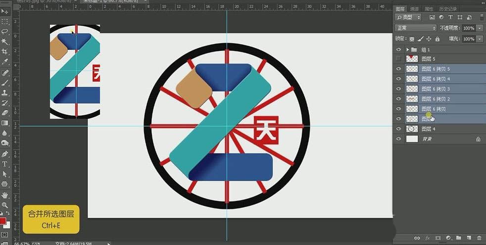 【新建图层 】【矩形选框 】画一条长方形,如图所示,【Ctrl+T 】【角度 】【30度 】,【Ctrl+Alt+Shift+T 】【重复动作 】5次,选择所有长方形【Ctrl+E 】合并【图层 】。