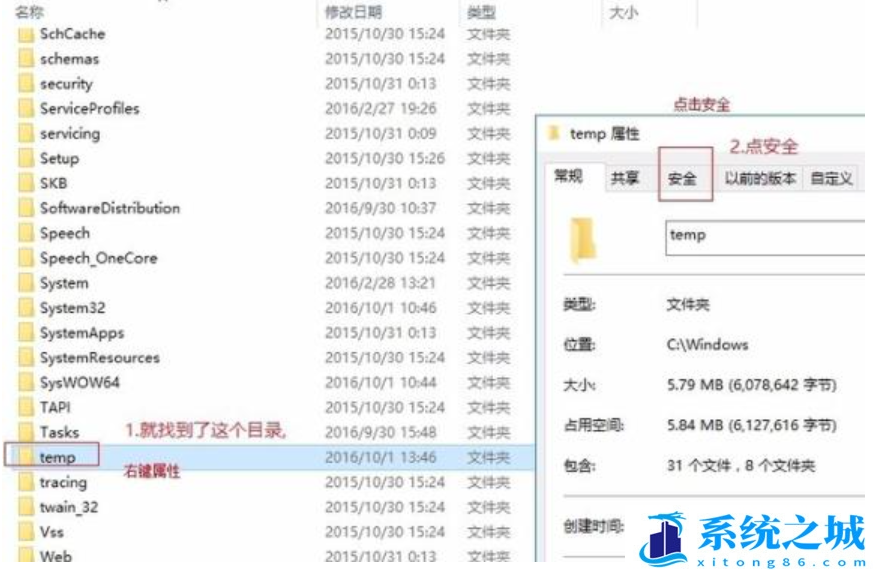 3、在c盘windows文件中找到“temp”文件,右击选择“属性”,点击“安全”。