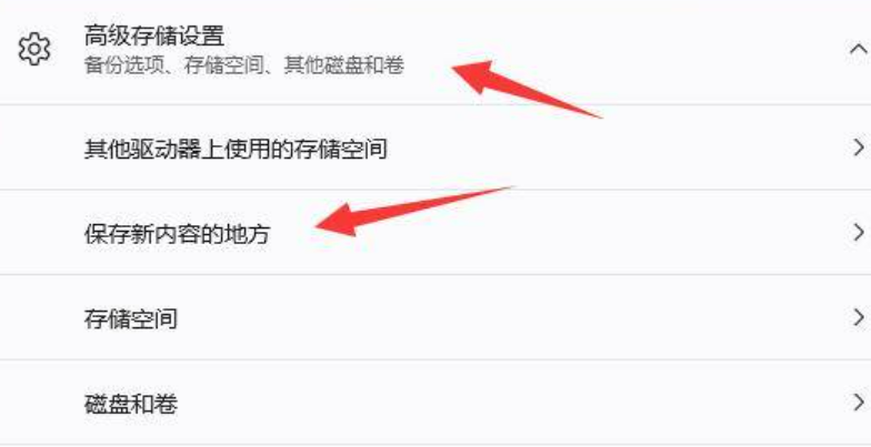 4、随后展开高级存储设置,打开“保存新内容的地方”。