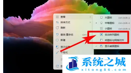 2、在查看目录之下,将“自动排列图标”和“将图标与网格对齐”两个选项都取消选中后,鼠标左键单击桌面空白处退出设置。