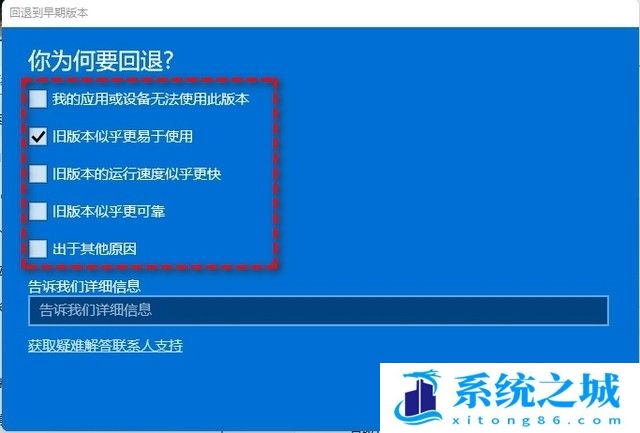 4、选择将Win11退回Win10的原因,然后点击“下一步”。