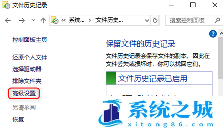 2、 在文件历史记录窗口界面中,点击左边的高级设置。