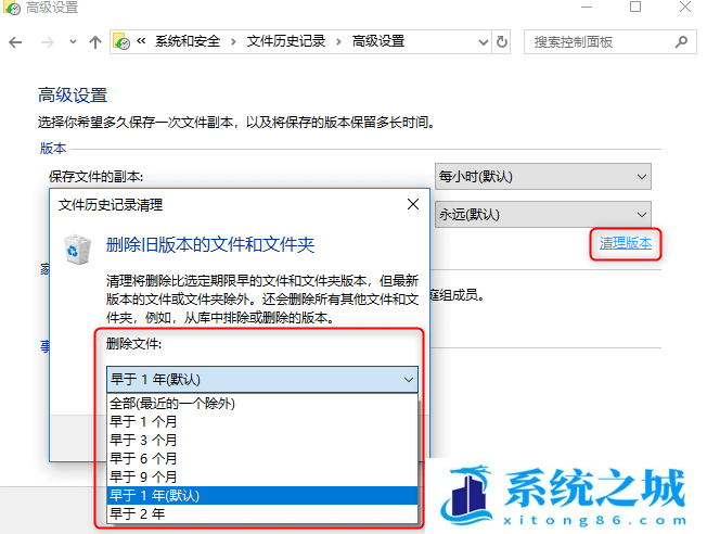 3、 进入高级设置界面之后,点击清理版本。在弹出的文件历史记录框界面中,选择我们需要删除的文件的时间段,点击清理即可,清理完成后,点击确定就可以啦。