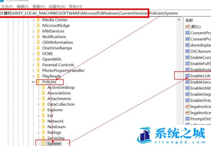 2、打开注册表之后点击依次展开:HKEY_LOCAL_MACHINE\SOFTWARE\Microsoft\Windows\CurrentVersion\Policies\System。