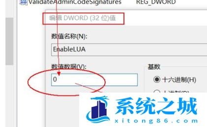3、在右侧找到“EnableLUA”,鼠标双击之后就在弹出的窗口界面中将数据数值由1改成0,后重启电脑即可开始移动。