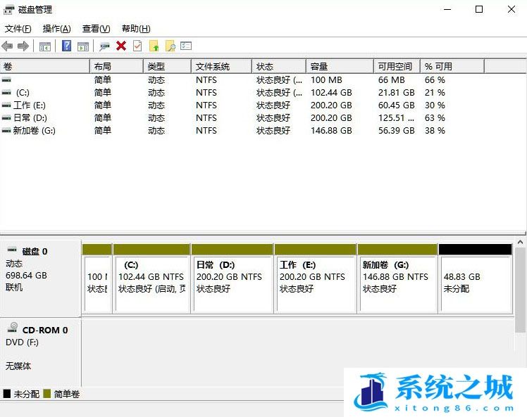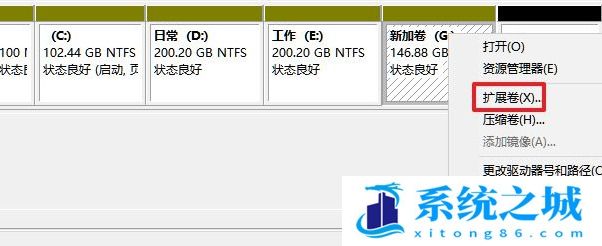 5、当然对于还未分配的空间,我们也可以选择它并进行分区,在选中的分区上右击,选择“扩展卷”即可(如图所示)。