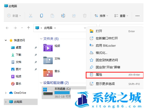 2.接着在打开的页面中,鼠标右键点击C盘,选择属性选项。