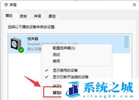 3、声音窗口,右键点击扬声器,在打开的菜单项中,选择【属性】;