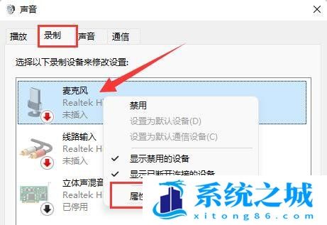 5、声音窗口下,切换到【录制】选项卡,选择麦克风后,点击【右键】,在打开的菜单项中,选择【属性】;