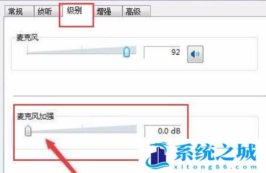6、切换到【级别】选项卡,将麦克风加强修改为【0】即可。
