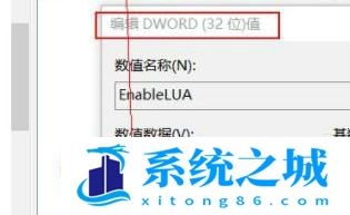 3、在右边找到“EnableLUA”,双击之后就在弹出的窗口中将数据数值由1改成0即可。