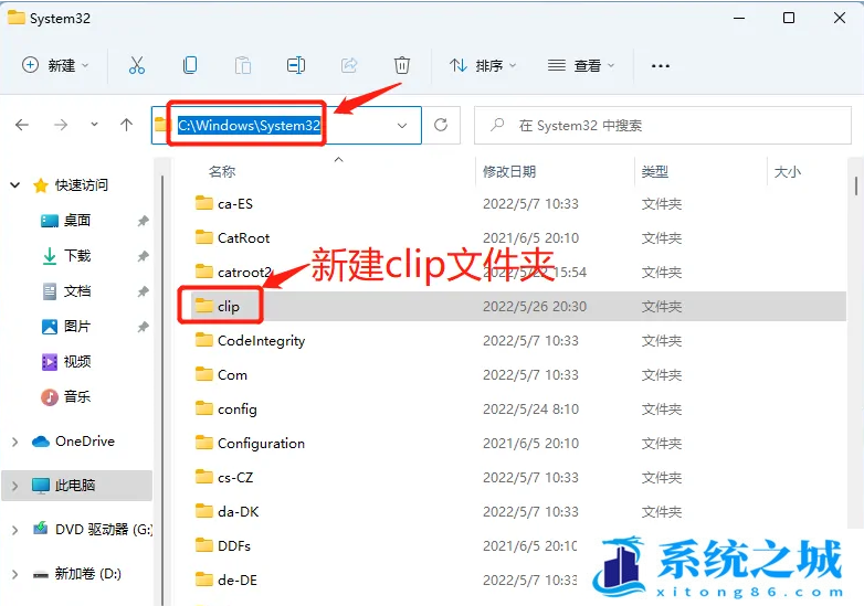 4、然后,根据路径【C:\Windows\System32】,在该文件夹查找,是否有【clip】子文件夹,如果没有,则新建一个;