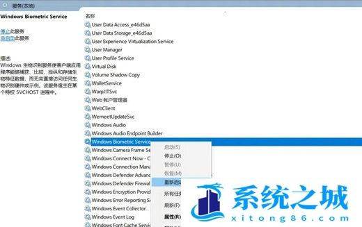 1.Windows+R输入services.msc,然后查找”Windows Biometric Service“服务重新启动。如下图: