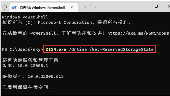 步骤二:使用DISM快速禁用或启用保留空间:查询系统保留空间是否启用DISM.exe /Online /Get-ReservedStorageState。